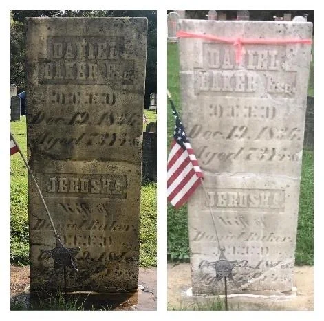 The restored marble headstone of Daniel and Jerusha Baker, before and after 2021 cleaning by Melissa Hilgeman and son Oliver. Photos by Melissa Hilgeman.