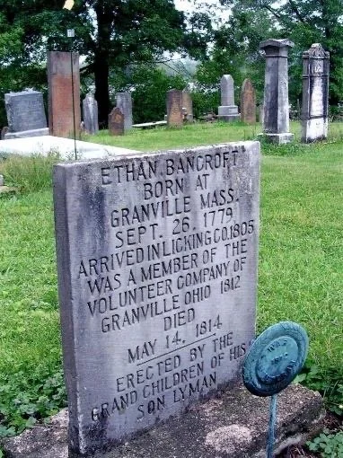 As farmlands were allocated in the new settlement, Ethan Bancroft and his wife Lucy selected a highly desirable tract to the east of town, located on both sides of what is now the Newark-Granville Road. According to Theresa Overholser’s account in Beneath This Sod: A Walk Through Granville’s Old Colony Burying Ground, this beautiful farm was graced by springs, a creek, and terrain suitable for fields, orchard, and pasture. The Bancrofts’ potentially idyllic life there was marred, however, by tragedy: First, their one-day-old infant, born in April of 1806, became the first burial in Granville’s newly-established burying ground. The location of the child’s grave is now lost. Then eight years later in 1814, Ethan himself was killed at the age of only 34 when he was thrown and kicked by an unruly colt as he tried to ride it home from the fields.