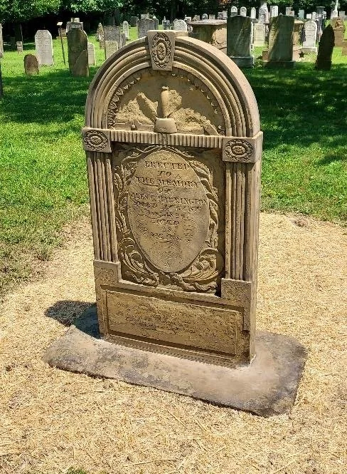 Harrington’s elaborate sandstone memorial was one of some 55 headstones in the Old Colony that were signed by a carver named “Hughes.” Two stone artisans were active in Granville headstone-making in the mid-19th century, the Rev. Thomas Hughes, and Rollin Hughes. Although it seems likely that the Hughes who created the Harrington stone was Thomas Hughes, the attribution is not entirely certain. In either case, the work on the Harrington stone is exquisite, exhibiting stunning design and exceptional craftsmanship in both text and ornamentation. The observant viewer will find Masonic symbols in the border decoration, including the traditional square and compass, and perhaps other Masonic iconography.