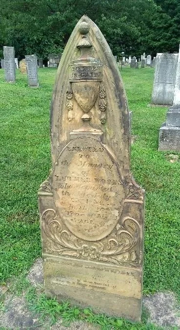The monument to Mr. Woods is an elaborate sandstone carved by a prominent stone carver, The Rev. Thomas Hughes, who was also pastor of the Welsh Hills Baptist Church northeast of Granville.